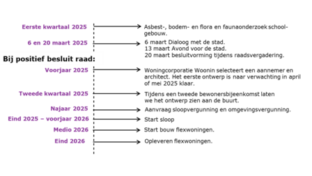 Om ruimte te maken voor de flexwoningen moet het schoolgebouw gesloopt worden. Afgelopen periode zijn er verkennende asbest-, bodem- en flora- en faunaonderzoeken gedaan om te kijken of het schoolgebouw gesloopt kan worden. Uit deze onderzoeken bleek dat er verder asbestonderzoek en vleermuisonderzoek nodig is. Beide onderzoeken zijn gestart en waarschijnlijk in de zomer afgerond.