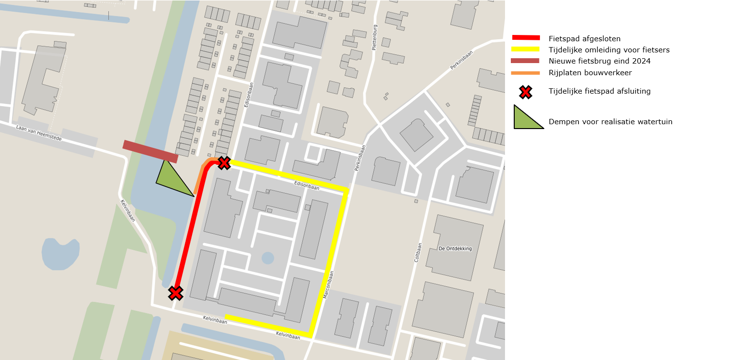 Eind van dit jaar komt er een nieuwe fietsbrug aan de zuidkant van het Edisonkwartier. De fietsbrug verbindt de toekomstige fietsstraat Laan van Rijnhuizen met het bestaande fietspad naar het Oosterlicht College. In voorbereiding hierop dempt aannemer Van Wijk een klein deel van de Watertuin. Dit gebeurt in de periode van 15 juli tot 25 augustus. De werkzaamheden duren waarschijnlijk 2 weken. De precieze weken waarin wordt gewerkt weten we niet. Fietsers van en naar het Edisonkwartier leiden we tijdelijk om via de Marconibaan.