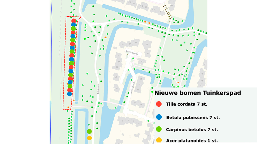 - Nieuwe bomen: ja, 5 haagbeuken, 6 winterlindes en 6 zachte berken