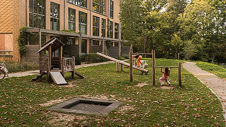 Er staan een speelhuisje, trampoline, duikelrek en wipwap. Ook staan er een bankje, een prullenbak en er is een pad.