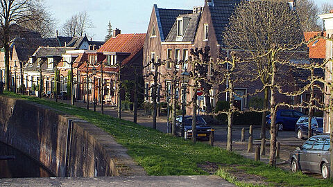 De leibomen aan de Frederiksoord en de Spuisluis kunnen gelukkig blijven staan. Bij de kademuur die we gaan vervangen, hebben we de leibomen tijdelijk verplaatst. Later planten we ze weer terug.
